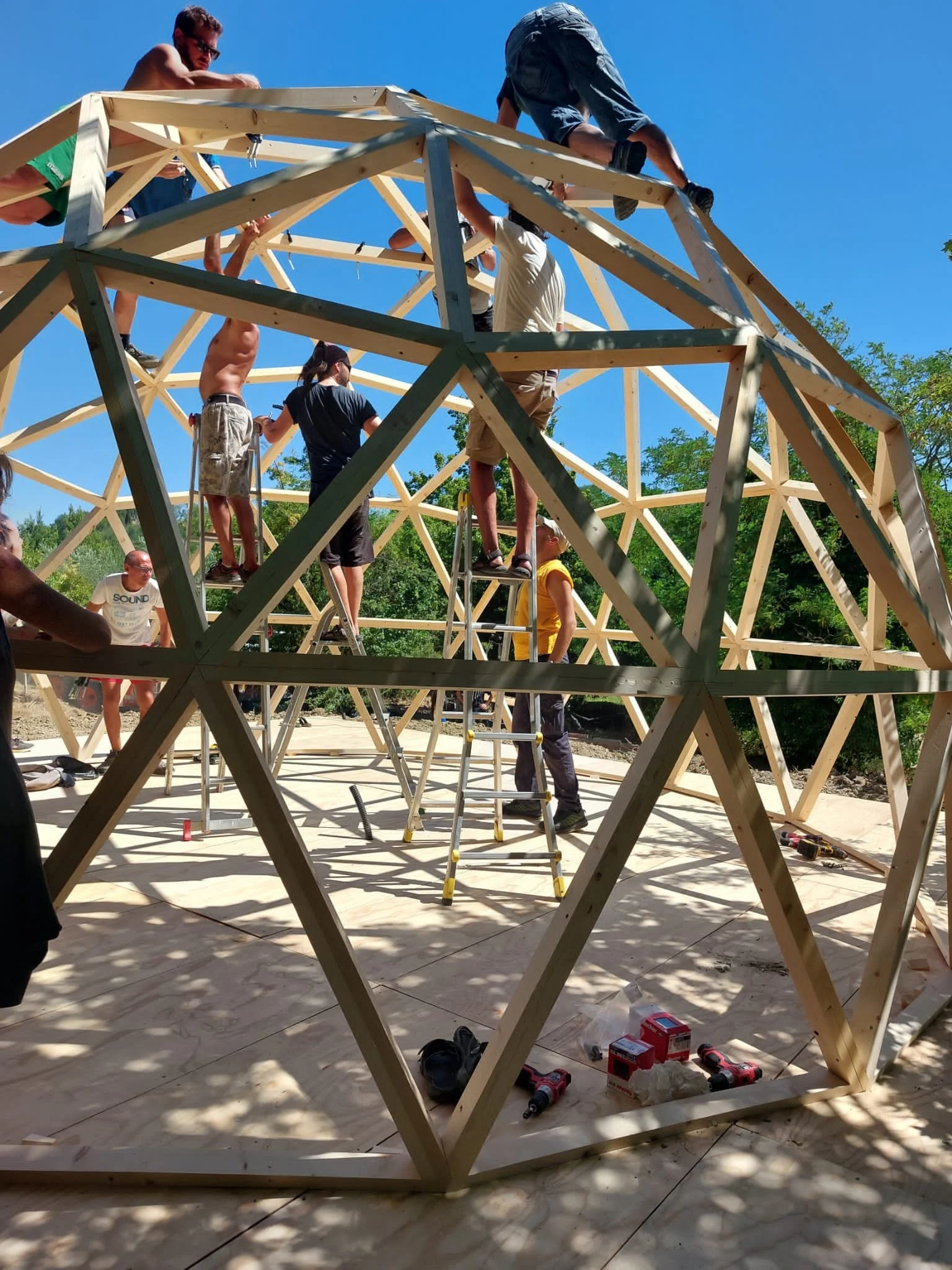 Partiamo dalla base, cioè, una cupola geodetica non è un unico pezzo, è un insieme di assicelle che prima danno vita ai triangoli, dopo a strutture geometriche più complesse per solo dopo diventare una mezza sfera perfetta. Se ci pensiamo a questo concetto possiamo scoprire che costruire una cupola geodetica è un lavoro di squadra,